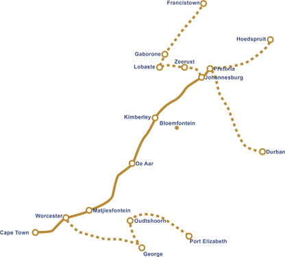 A rota entre Pretoria e Cape Town é uma jornada de 27 horas e 1600 Km através do mais diverso e espetacular cenário do continente africano.
